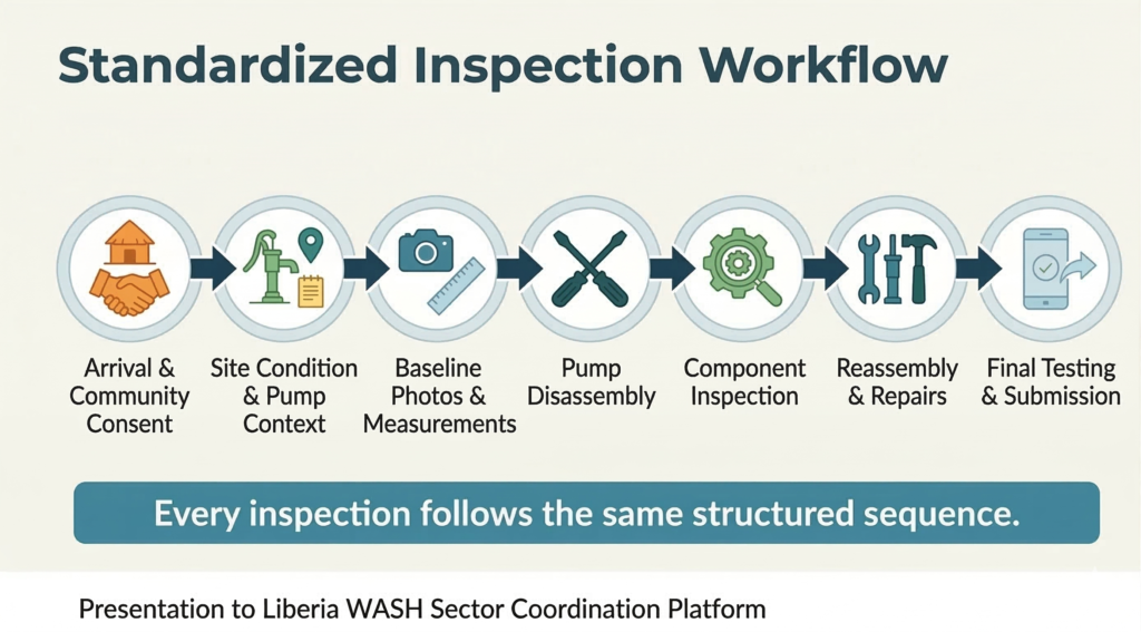 The approach combines trained technicians, standardized inspection procedures, and digital reporting tools to support long-term water system sustainability.